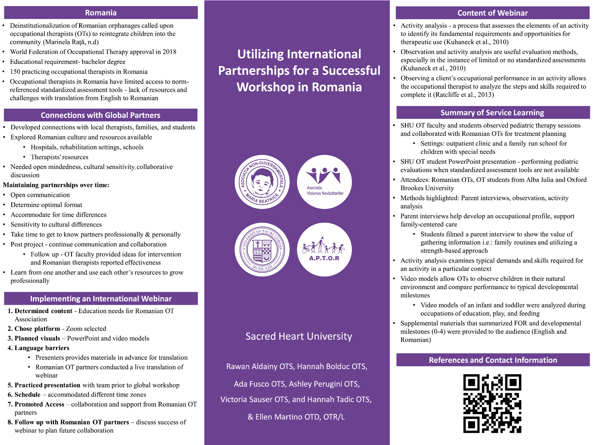 At the Spring 2023 ConnOTA Conference, I was the primary speaker for my capstone poster and presented on implementing an international webinar. I also had the pleasure to volunteer at this event where I introduced, concluded, and moderated sessions at the conference. Included below, is a copy of the poster and the CEUs obtained from attending the event.